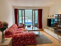 Offering a generous open-plan living area with floor-to-ceiling doors leading onto a substantial private terrace with elevated town and hillside views.